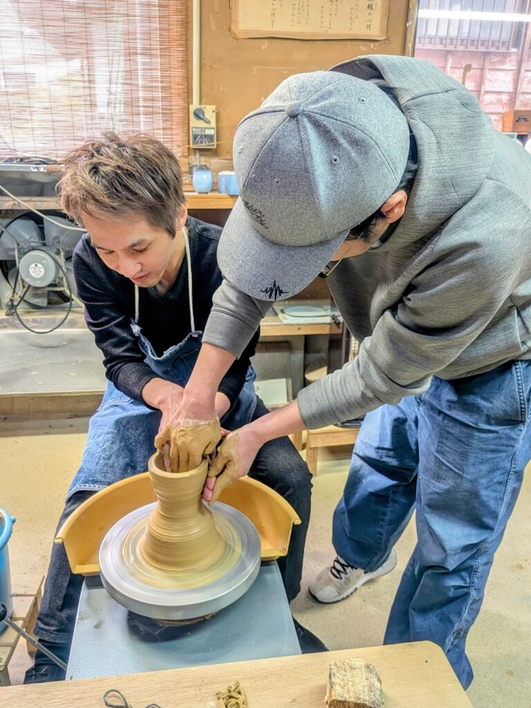 今回の旅では、虎仙窯の代表でもある川副さんの指導のもと、ろくろ回しの体験をさせていただきました。