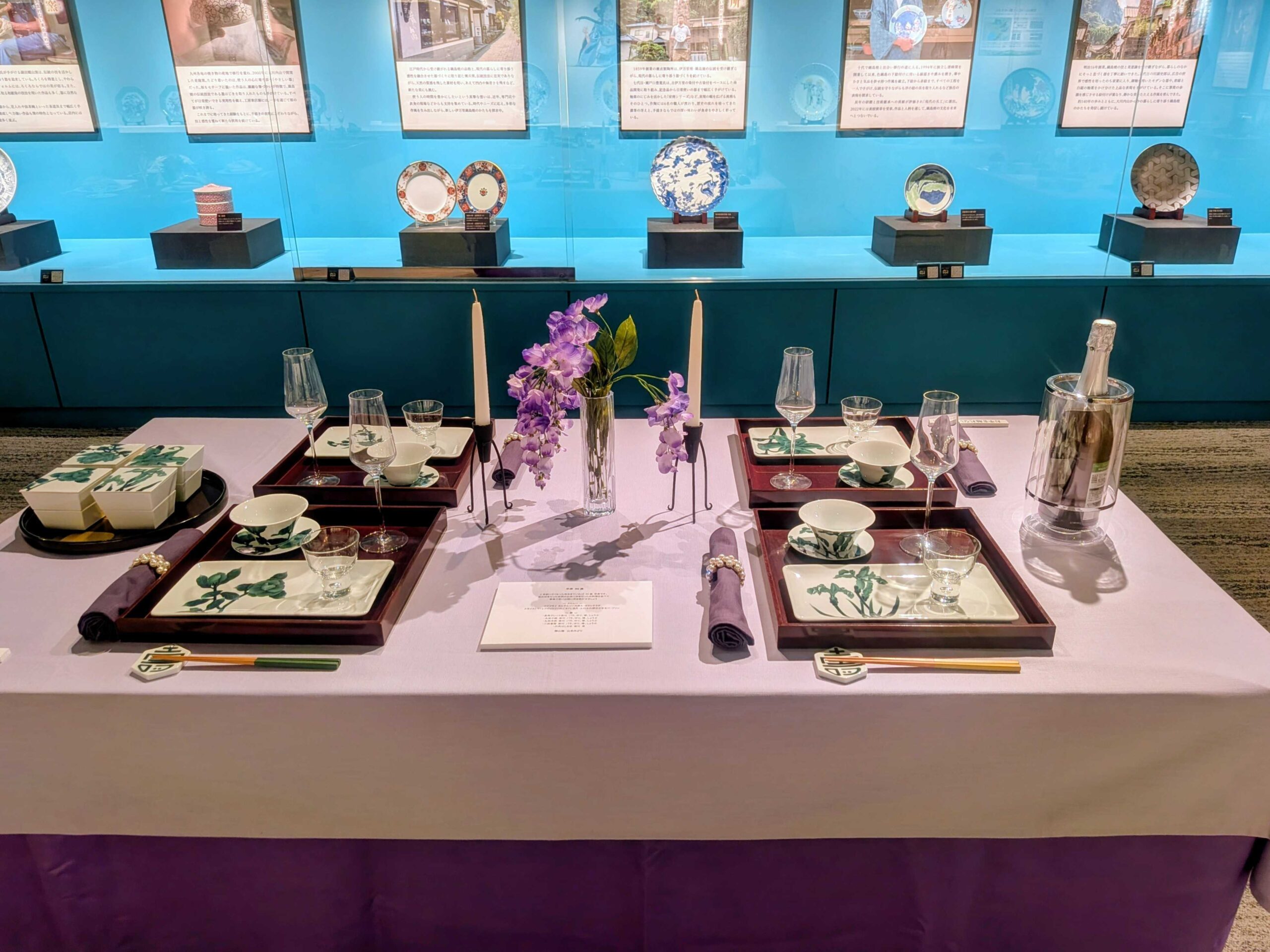 巒山窯の作品を使ったテーブルウェアの展示(伊万里・有田焼伝統産業会館)
