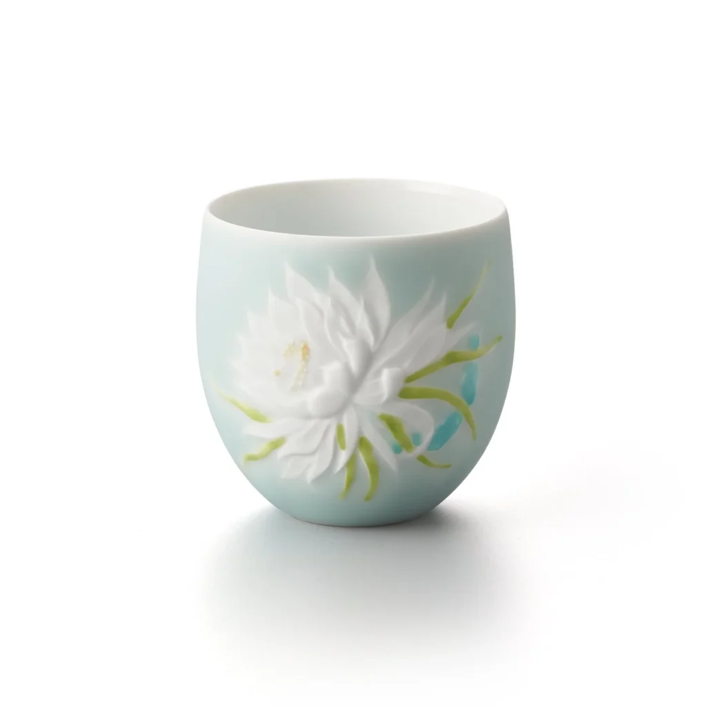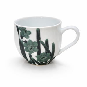 墨弾きによる線描が静かに浮かぶ緑の花文は、鍋島焼の伝統を感じさせつつ、やわらかな筆の表情が印象的です。